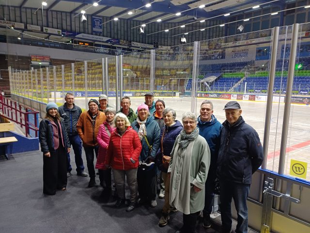 Die Kolpingsfamilie Partenkirchen, durfte sich ein Bild vom Olympia Eissportzentrum machen. Die Technische Leiterin der Gemeindewerke Frau Dr. Sabine Wagner und Stellv. Leiter für Eisstadion Schwimmbad Technik Herr Andreas Huber, gaben nach einer kleinen geschichtlichen Einführung, warum dieser Standort 1930 gewählt wurde. Sowie Bilder, der weiteren Zubauten von Technik, Gebäude, das Dach, dem BHKW, Solaranlage und jetzt die neue Flexbande, die mit viel Eigenarbeit kostensenkend installiert wurde, und das Stadion zukunftssicher für den Spielbetrieb macht. Der Stromverbrauch des Eisstadions ist je nach Wetterlage bedingt ca. ein Fünftel des Ortes. Weiter gings zum elektronischen Eisaufbereiter, und in den Untergrund des Eisstadions. Hier gab es Infos zu technischen Details der Ammoniak Anlage und Sicherheitsanmerkungen.